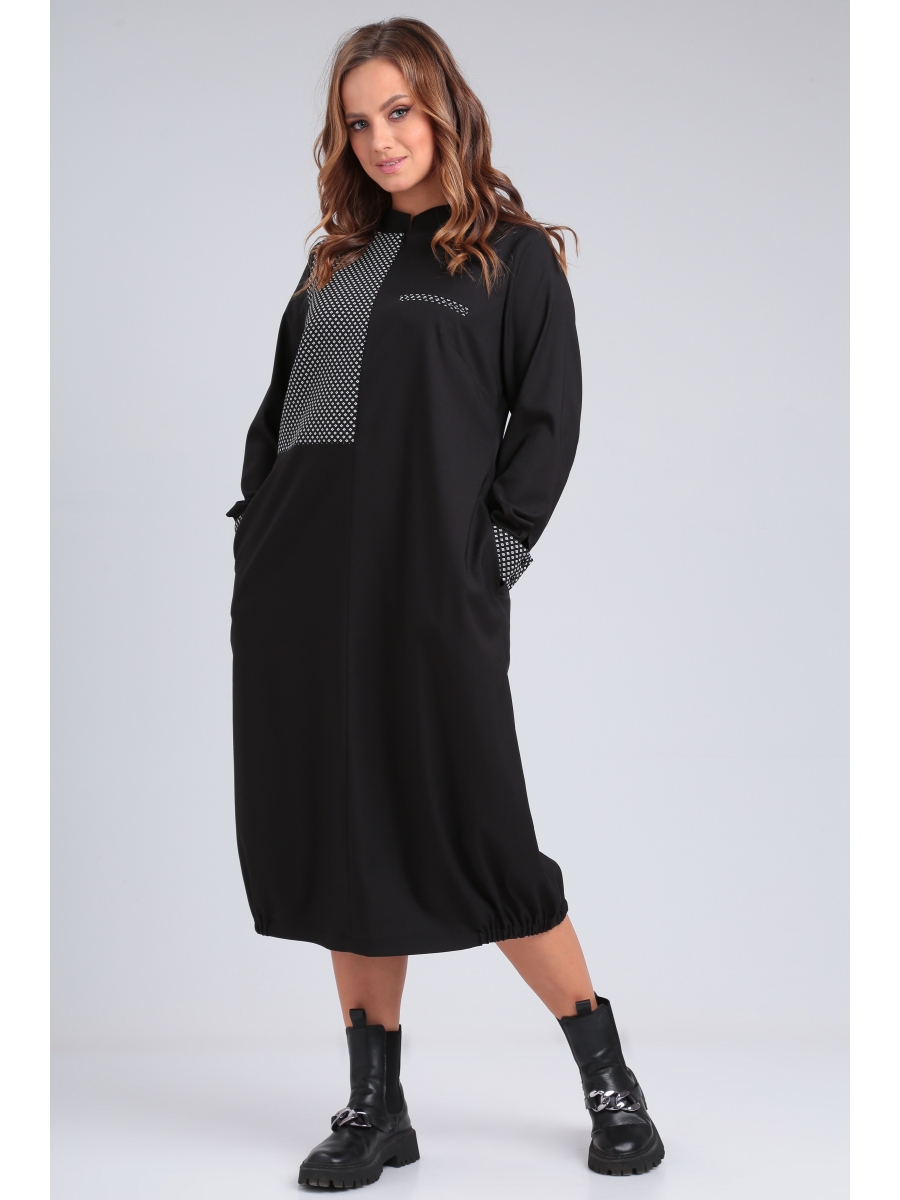 Платье свободного силуэта из костюмно-плательной ткани. Горловина округлой формы со стойкой. Перед платья с застежкой на молнию в среднем шве, нагрудными вытачками, подрезом и карманом-обманкой из отделочной ткани. Спинка со средним швом, подрезом из отделочной ткани и декоративной нашивкой. В боковых швах глубокие функциональные карманы. Рукав втачной длинный, по низу декоративная манжета с застежкой на петлю и пуговицу. По низу платья по бокам вставлены резинки.