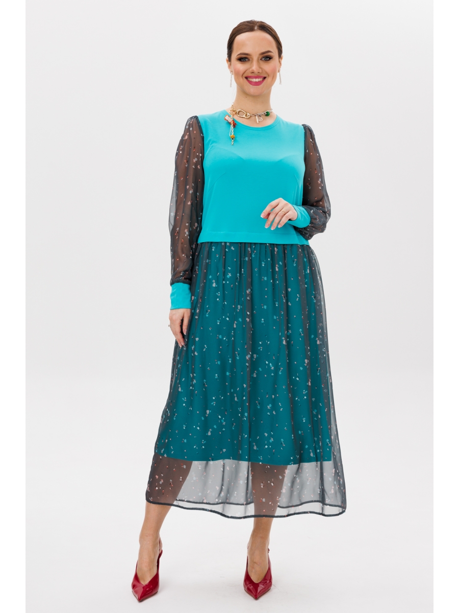 Элегантное женское платье прямого силуэта из двух видов ткани: спинка, полочка и манжет из трикотажного полотна. Рукава и юбка из шифоновой ткани. Платье отрезное по линии талии со сборкой, из бокового шва идет грудовая выточка, рукав на манжете со сборкой по окату. Юбка на подкладке.