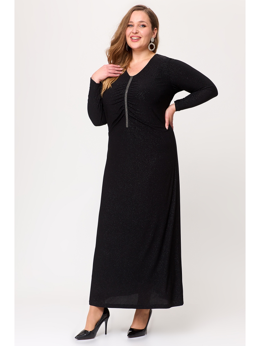 Элегантное, нарядное платье - необходимость женского гардероба. Такая модель идеально подходит для любого торжества. Аккуратный вырез позволяет поиграть с выбором украшений. Продуманная длина и декоративная тесьма по полочке визуально вытягивают силуэт и при этом не отнимают такой необходимый для уверенности в себе комфорт. А слегка расклешенный силуэт тактично очерчивает фигуру, придавая владелице платья стройность. Рукав - длинный. Спинка со средним швом и обработанной длинной капелькой на петлю и пуговицу. Простое в уходе платье больших размеров неоднократно порадует Вас!