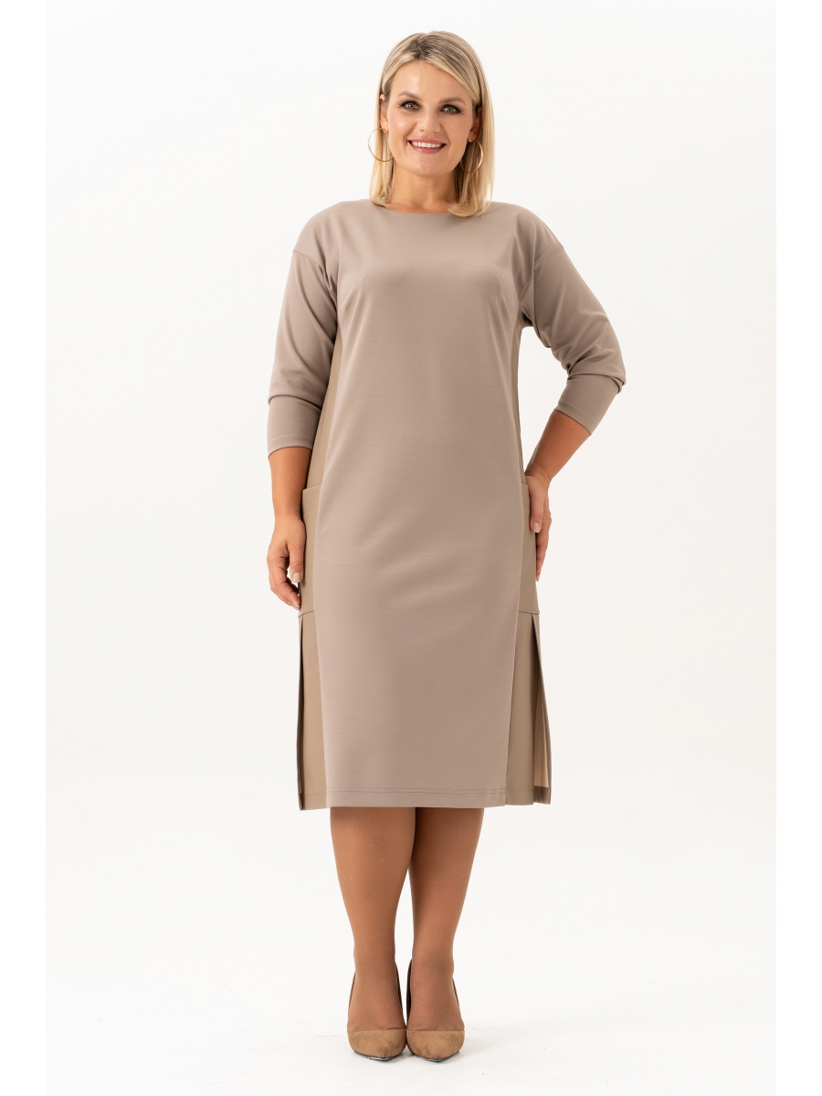 Базовое женское платье прямого кроя больших размеров - это идеальный выбор для создания стильного образа. Трикотажное платье подойдет как для повседневного использования, так и для офиса. Цвет нежного капучино придает глубину и загадочность образу, позволяя легко переходить от дневного к вечернему стилю. Кроме того, модель сочетается с любыми аксессуарами и обувью, что делает его универсальной базой гардероба. Строгий при этом простой и лаконичный дизайн делает его достаточно универсальным, чтобы подходить практически любому типу фигуры. Длинные рукава создают эффектную линию, а удлиненный крой придает ей свободный и стильный вид. Эффектная модель платья идеальный выбор для женщин с пышными формами, которые хотят выглядеть стильно и элегантно. Однотонное платье со спущенным плечом, свободная посадка прямого кроя и приятная немнущаяся ткань идеально садится на большие размеры . Вставка из ткани экокожи добавляет модного акцента. Прямой крой корректирует силуэт визуально делая женскую фигуру более стройной, а длина миди ниже колена позволит скрыть недостатки и фигура приобретет более подтянутый вид. На боковых швах обработаны накладные карманы и разрезы. Платье подчеркнет вашу индивидуальность и станет ярким акцентом в вашем образе.
