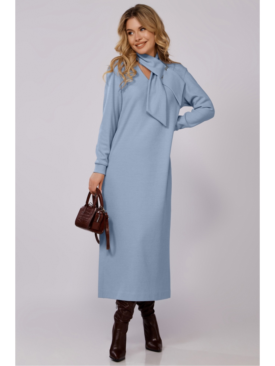 Платье женское, прямого силуэта, со спущенной линией плеча, с втачными рукавами, длиной до середины икр, со съемным воротником, который застегивается на украшение-брошь. Деталь переда платья с нагрудными вытачками. Правый боковой шов заканчивается разрезом. Рукава втачные одношовные, с притачными манжетами. Вырез горловины платья «V- образной» формы. Декор может отличаться от представленного на фотографии.