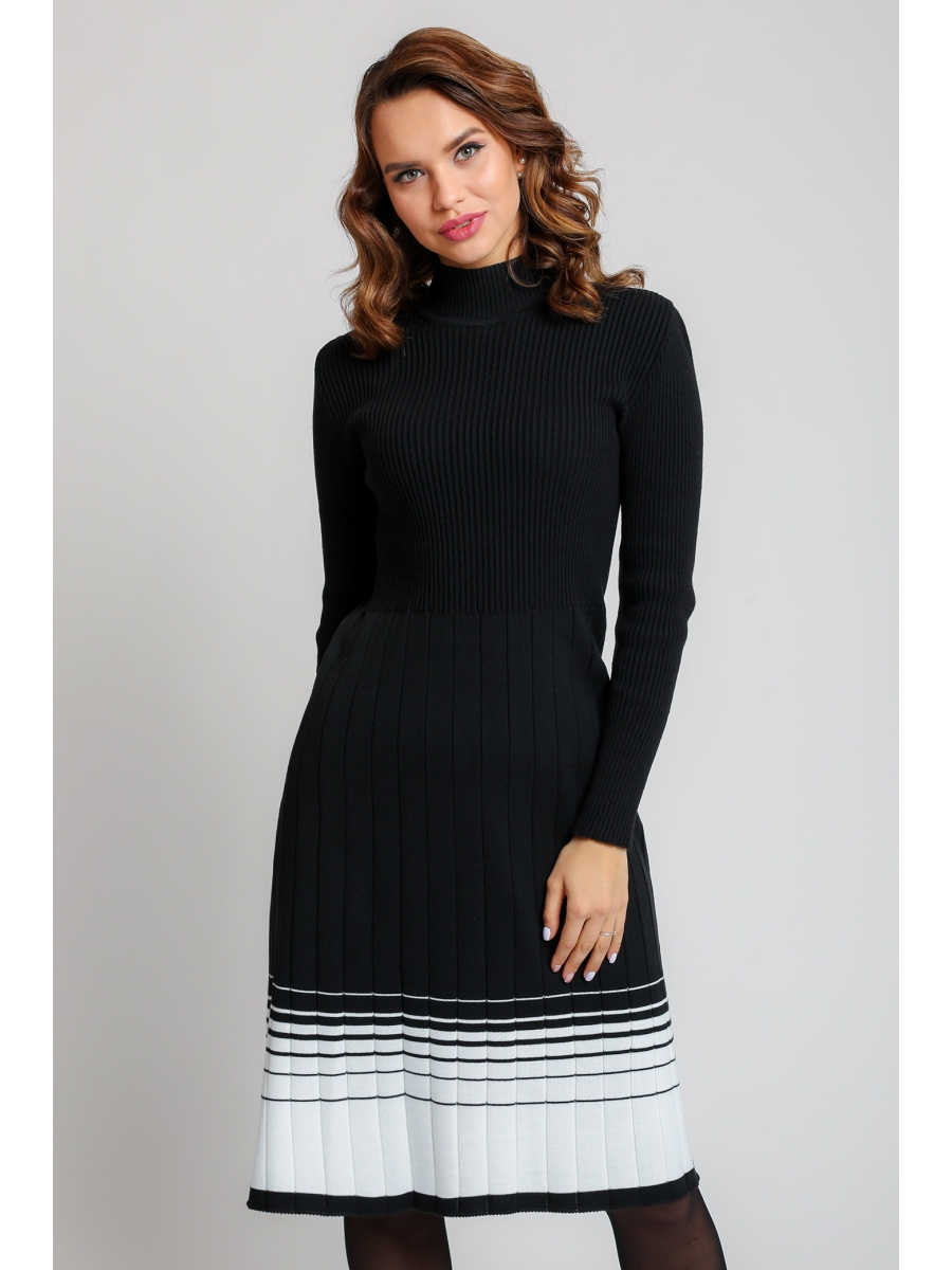 Трикотажное платье облегающего силуэта длиной до колена. Невысокий одинарный воротник-стойка. Рукава втачные длинные. Платье выполнено сочетанием видов элластичных переплетений с переходом цвета от темного к светлому по низу платья.