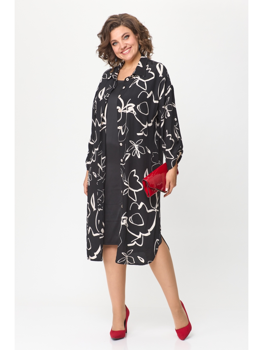 Платье-рубашка это тот предмет гардероба, который любят женщины во всем мире. Стилизация с платьем-рубашкой придает много женственности и красоты любой фигуре. Платье состоит из удлинённой рубашки с отложным воротником. По передней части планка, застежка пуговицы. Свободный крой, по бокам фигурные подрезы. Вторая деталь этого наряда имитация платья. То есть передняя часть платья однотонного черного цвета вшита по боковым швам в саму рубашку и создается впечатление, что наряд двухпредметный. В растегнутом виде смотрится как платье и поверх надета рубашка. Однотонная часть платья выполнена из мягкой и приятной ткани CREP VELVET SIYAN. Ткань цветная BRUNO на вид как плотный атлас. Обе ткани хорошо ложатся и выглядят богато.