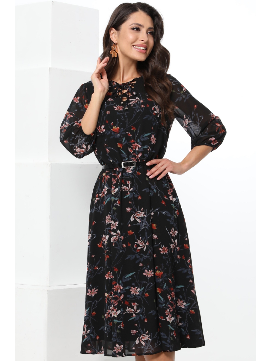 Изюминка платья - треугольное декольте с необычной шнуровкой из ткани в тон платью. С ее помощью можно менять ширину декольте по желанию. Пышный рукав напоминает рукава платьев принцесс. Завершает образ тонкий поясок.