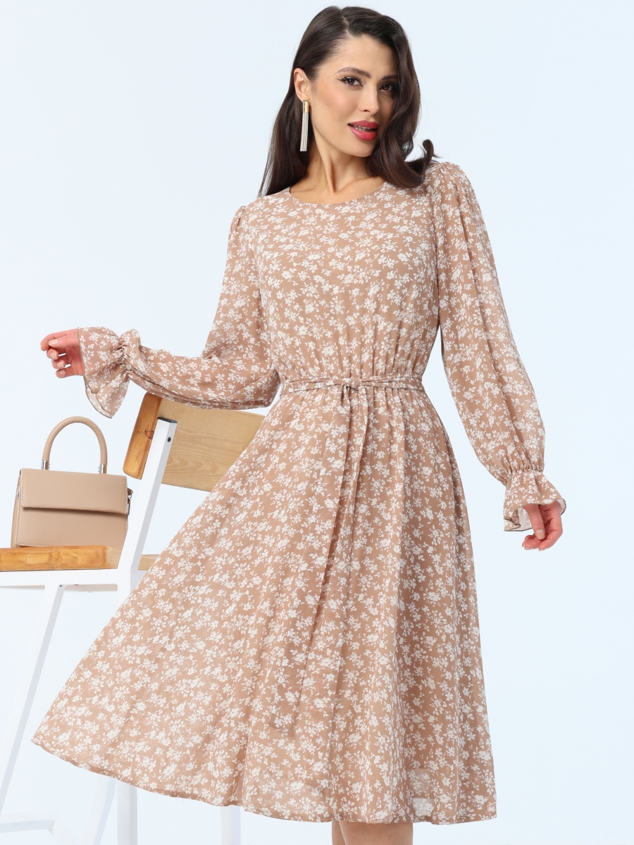 Платье с мелким принтом подойдет женщинам любой комплекции. Резинка, вшитая в талии, красиво драпирует его по фигуре. Пышная, отрезная юбка и рукав, собранный на резинку с небольшим воланом, создают красивый романтичный образ. Подчеркнуть талию можно с помощью пояса. Платье не просвечивает и подойдет для прохладных дней.