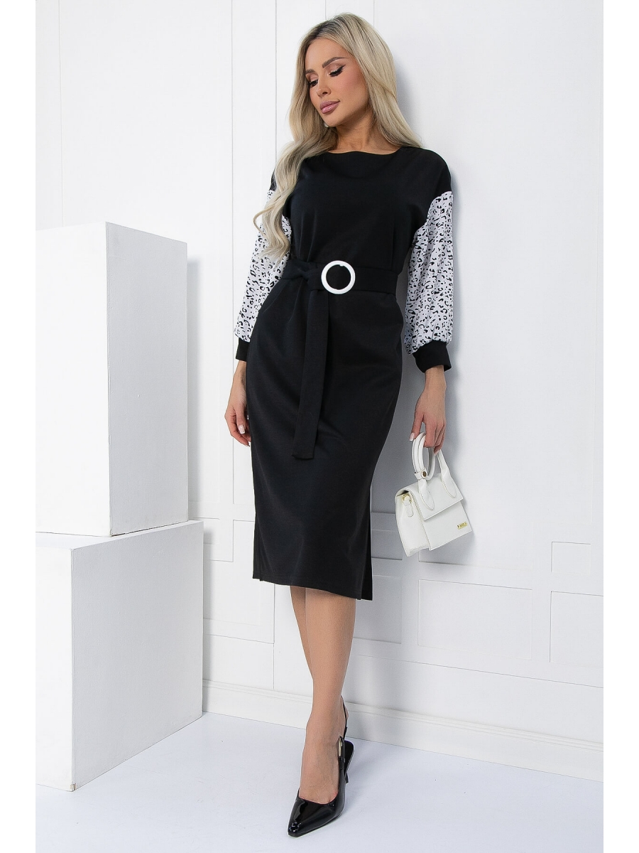 Платье средней длины с разрезами по бокам идеально подойдет для создания элегантного и утонченного образа. Округлый вырез и приспущенные плечи придают модели лёгкость и элегантность. Рукав длиной 3/4 заканчивается манжетой из основной ткани, создавая гармоничный образ. Платье выполнено в классическом чёрно-белом цвете, что делает его универсальным для любого случая. Особое внимание привлекает белая пряжка на поясе, которая добавляет изюминку и подчёркивает талию. Благодаря прямому крою, это платье стройнит и подходит для любого типа фигуры, обеспечивая комфорт и уверенность в себе.