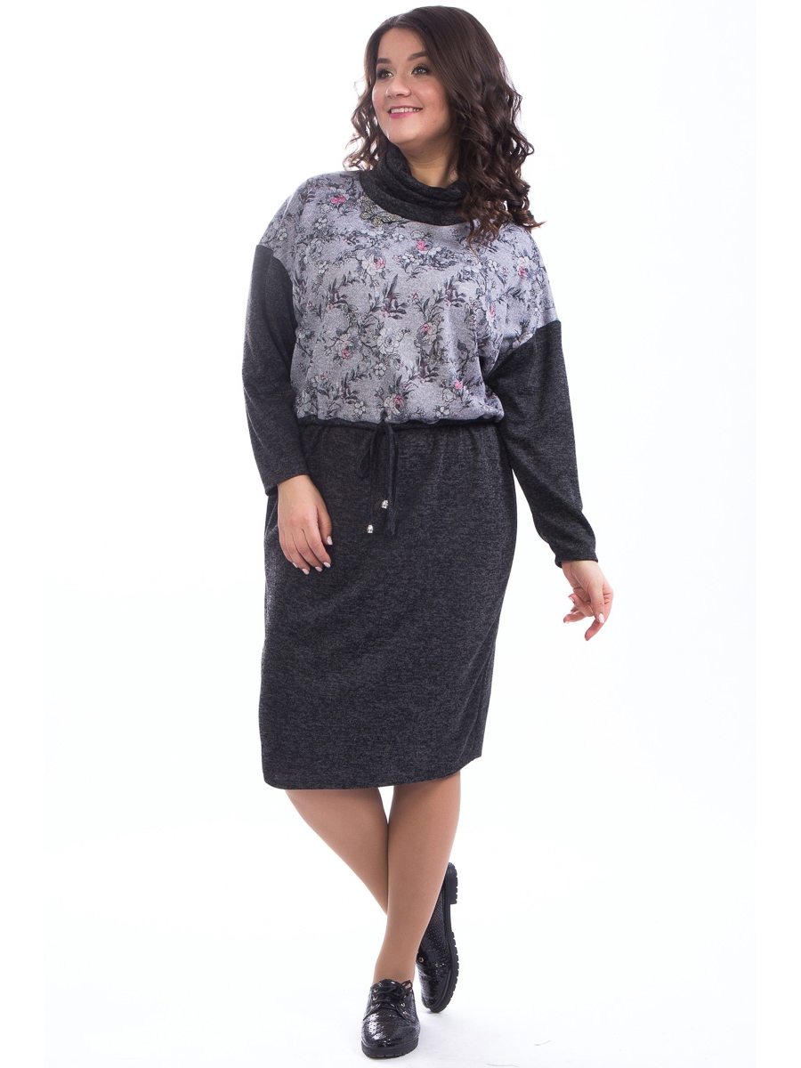 Стильное платье прямого силуэта из трикотажного полотна серого цвета с цветочным принтом. Круглый вырез изделия дополнен воротником-хомут. Платье отрезное по линии талии, дополнено кулиской на завязках. Изделие с втачными рукавами со спущенной линией проймы.