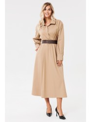 Платье женское из текстильной ткани, отрезное по линии талии, расширенное к низу. По юбке спереди и сзади заложены складки. В боковых швах расположены карманы. По центру лифа есть потайная застежка на петлях-пуговицах. Верхняя часть спинки с кокеткой. Рукав одношовный, низ рукава обработан манжетой на петлях-пуговицах. В платье спущенное плечо. Вырез горловины обработан воротником со стойкой. Платье свободное. Низ платья обработан широкой обтачкой с закрытым швом.