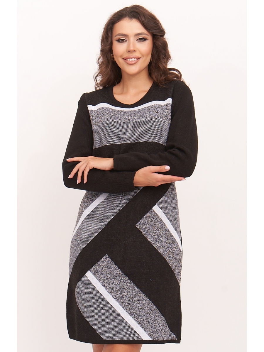 Вязаное платье женское полуприлегающего силуэта длиной до колена. Рукава втачные длинные. Горловина круглая, обработана бейкой. Жаккардовое переплетение из диагональных полос контрастного цвета. Платье вязаное из полушерстяной пряжи и подходит для использования в зимний период.