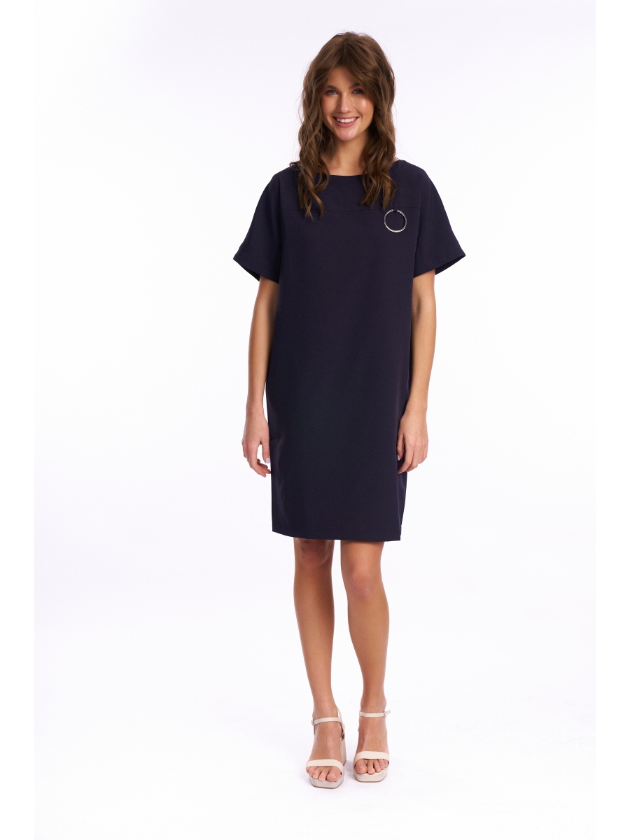 Платье женское свободного кроя, прямого силуэта с цельнокроеным рукавом. Горловина – лодочка.На левой стороне переда декоративное металлическое кольцо. Спинка с фигурным вырезом, украшена металлическими кольцами.