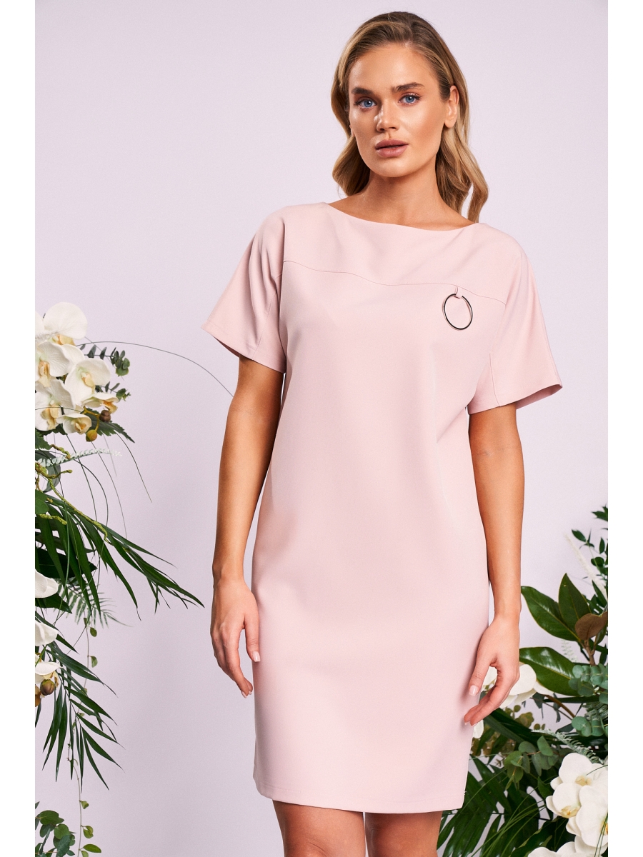 Платье женское свободного кроя, прямого силуэта с цельнокроеным рукавом. Горловина – лодочка.На левой стороне переда декоративное металлическое кольцо. Спинка с фигурным вырезом, украшена металлическими кольцами.