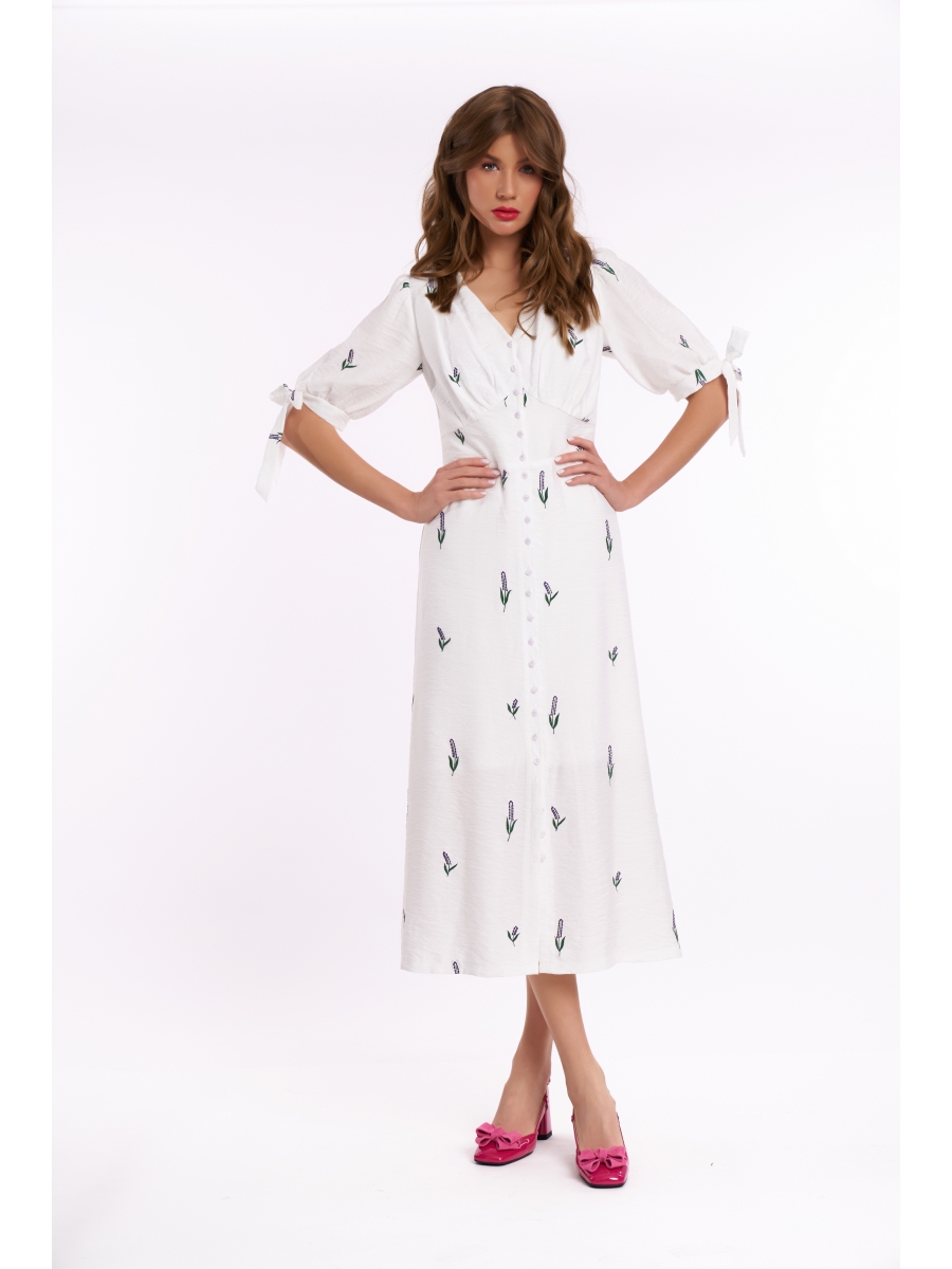 Нежное женское платья прилегающего силуэта, отрезное по линии талии. Перед с атласным фигурным поясом и сборкой под грудью. Юбка конической формы длиной ниже линии колена. Вырез горловины глубокий. V-образный. Рукав втачной со сборкой по линии отката и низу. Манжет притачной с завязкой на бант. Платье с застежкой на петли и пуговицы.