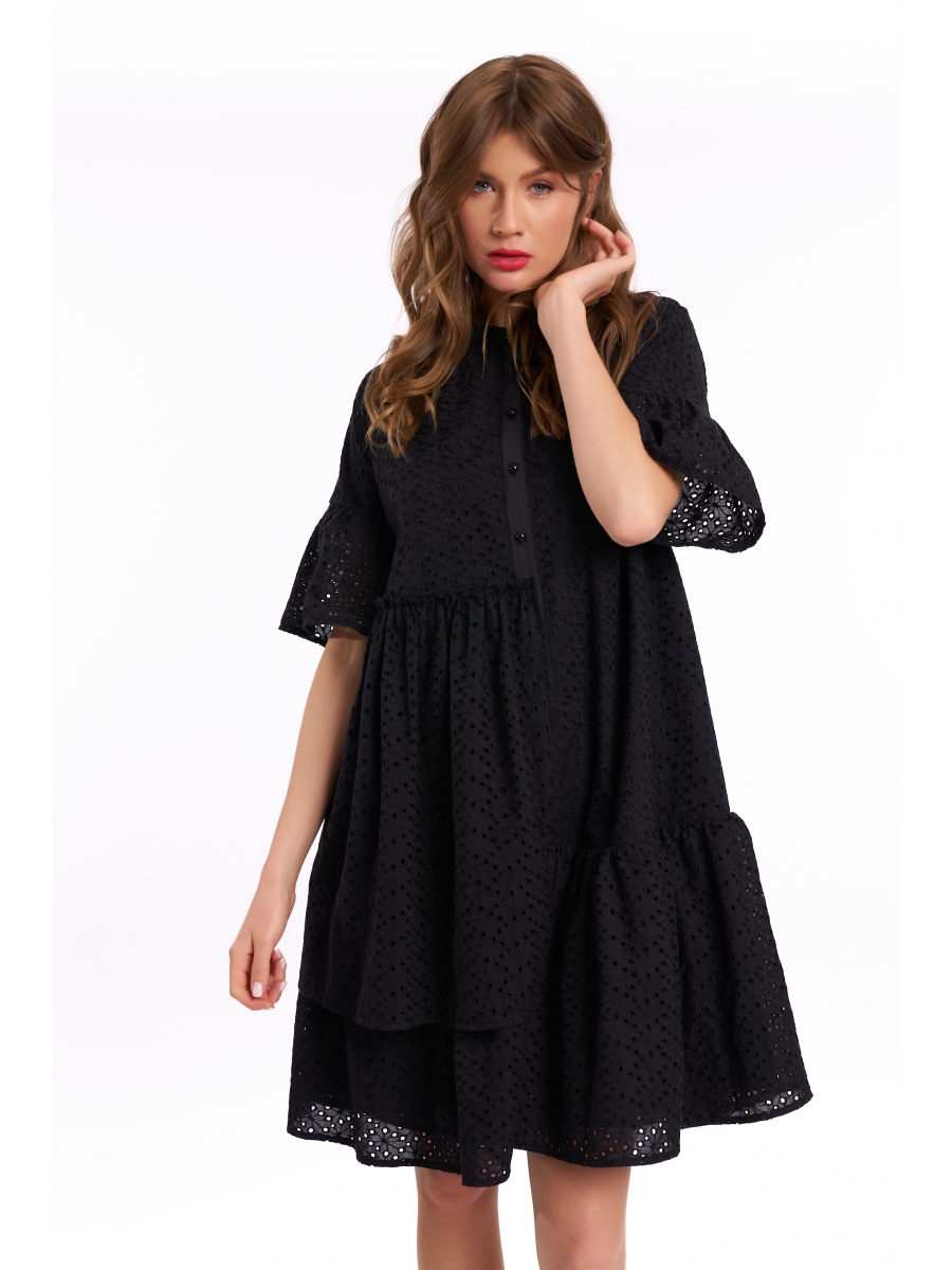 Женское платье прямого силуэта большого объема, длиной до линии колена. Платье отрезное по линии бедра. Перед с притачными планками, застегивающимися на петли и пуговицы. На правой части переда ниже линии груди расположен настрачной волан. Рукав цельнокроеный, короткий с притачными манжетами на сборке. Воротник стойка с застежкой на пуговицу. Низ платья с притачными воланом на сборке. Платье на хлопковой подкладке.