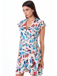 Платье из легкой принтованной ткани для жаркого лета. Первое платье с запахом сконструировала Эльза Скиапарелли в 30-х годах прошлого столетия, но популярным его сделала Диана Фон Фюрстенберг в 70-х годах. Платье стало трендом всех сезонов! Его крой актуален для любых типов фигуры. Полуприлегающий силуэт с функциональной застежкой на запах и завязывающимся деталями по линии талии. Рукава-воланы короткие. Вырез горловины V-образный. Низ платья слегка расширен и дополнен воланом. Идеальное решение для любого случая!