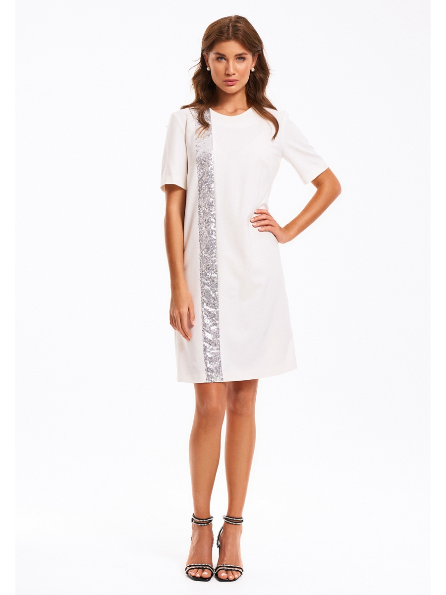Платье женское прямого силуэта. Перед с нагрудными вытачками и декоративной вертикальной деталью, выполненной из отделочного материала – «пайетки». Спинка со средним швом и застежкой на потайную «Молнию». Рукав втачной, короткий. Платье длиной до линии колена.