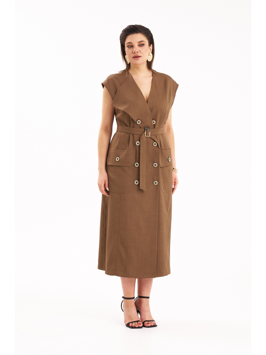 Платье двубортное с асимметричным отложным лацканом, слегка спущенным плечом и накладными карманами с клапанами по переду. Все швы и рельефы платья отстрочены двойными строчками. Изделие комплектуется текстильным ремнём на пряжке.