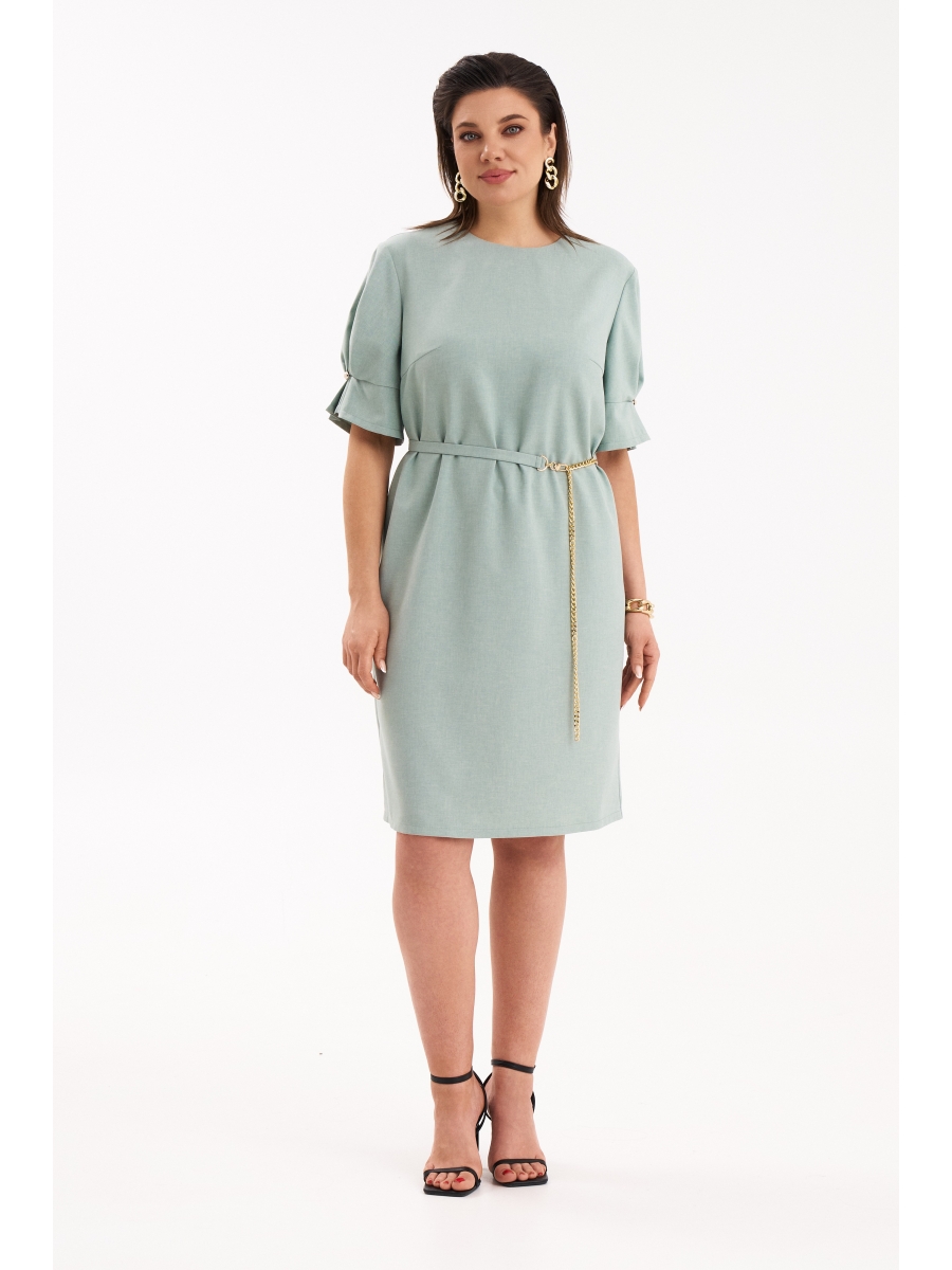 Платье с драпировкой на рукавах О-образного силуэта. Длина чуть выше колена. В среднем шве спинки потайная молния и шлица. Комплектуется текстильным ремнём с золотой цепочкой.