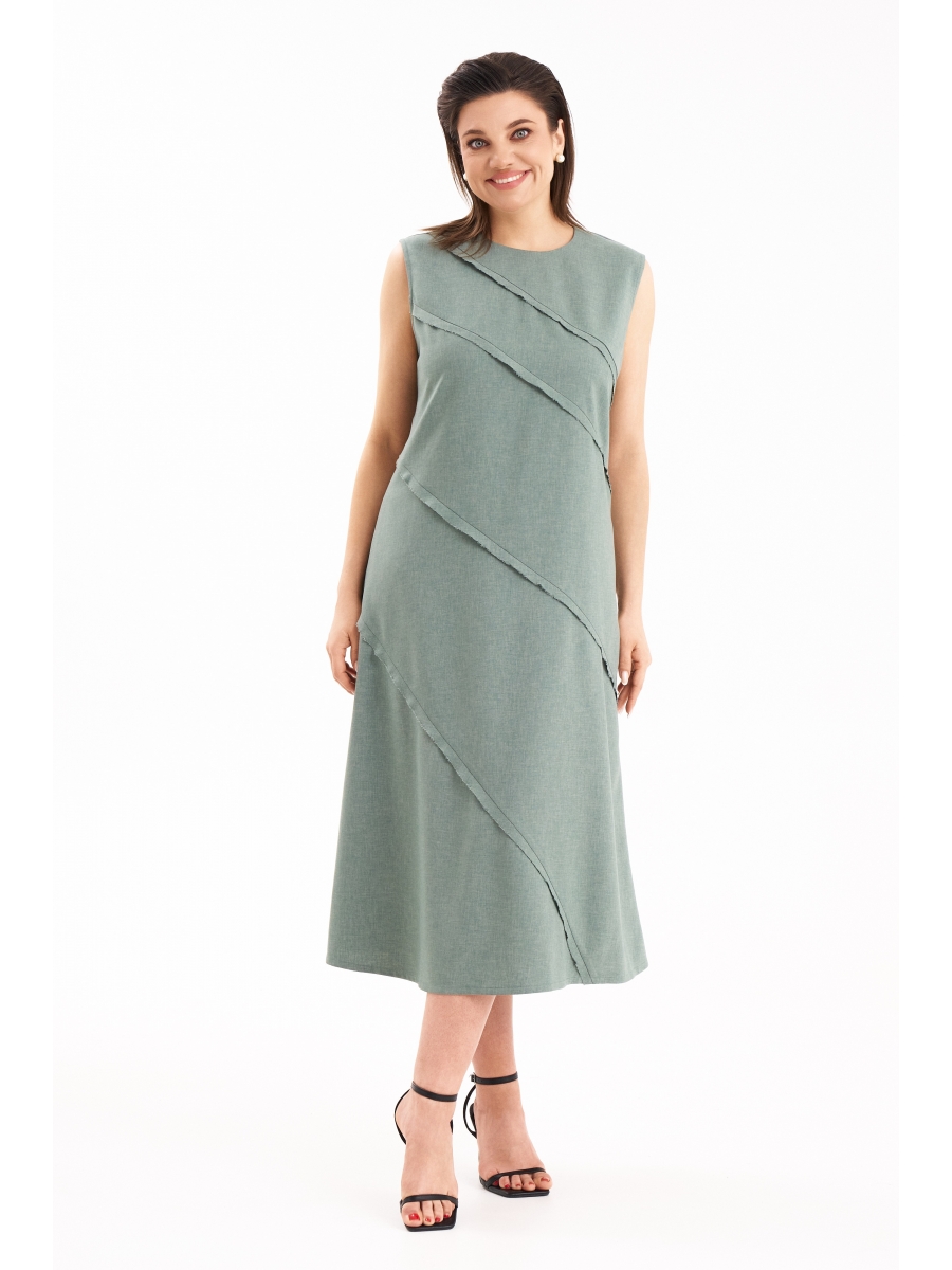 Платье А-образного силуэта длиной миди. Линия плеча слегка спущена, по переду идут диагональные подрезы с вставкой из косой бейки из основной ткани. Спинка слегка приталена вытачками. Застёжка на потайную молнию сзади.