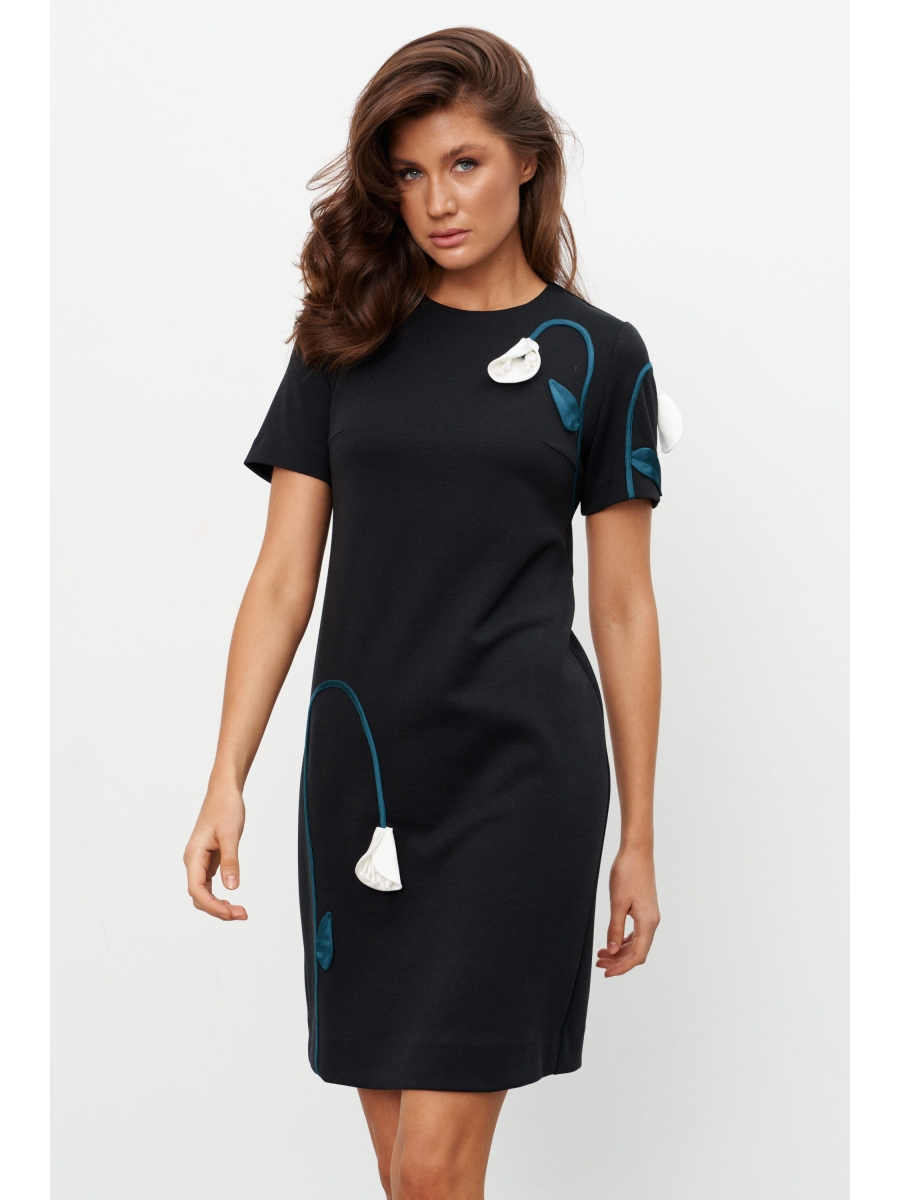 Платье из трикотажного полотна прилегающего силуэта с коротким, втачным рукавом. Длина платья выше колена. Перед изделия задекорирован контрастными, текстильными цветами. Сзади разрез и застёжка на потайную молнию.