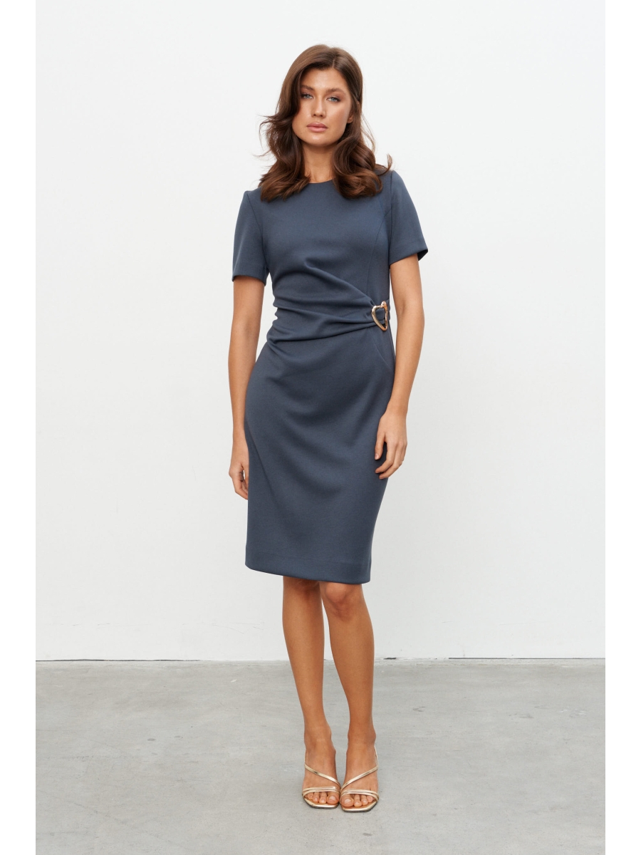 Оформить заказ →Платье из трикотажного полотна прилегающего силуэта с коротким, втачным рукавом. Длина платья выше колена. Перед изделия задекорирован мягкой драпировкой в области талии с декоративной металлической пряжкой. Сзади разрез и застёжка на потайную молнию.