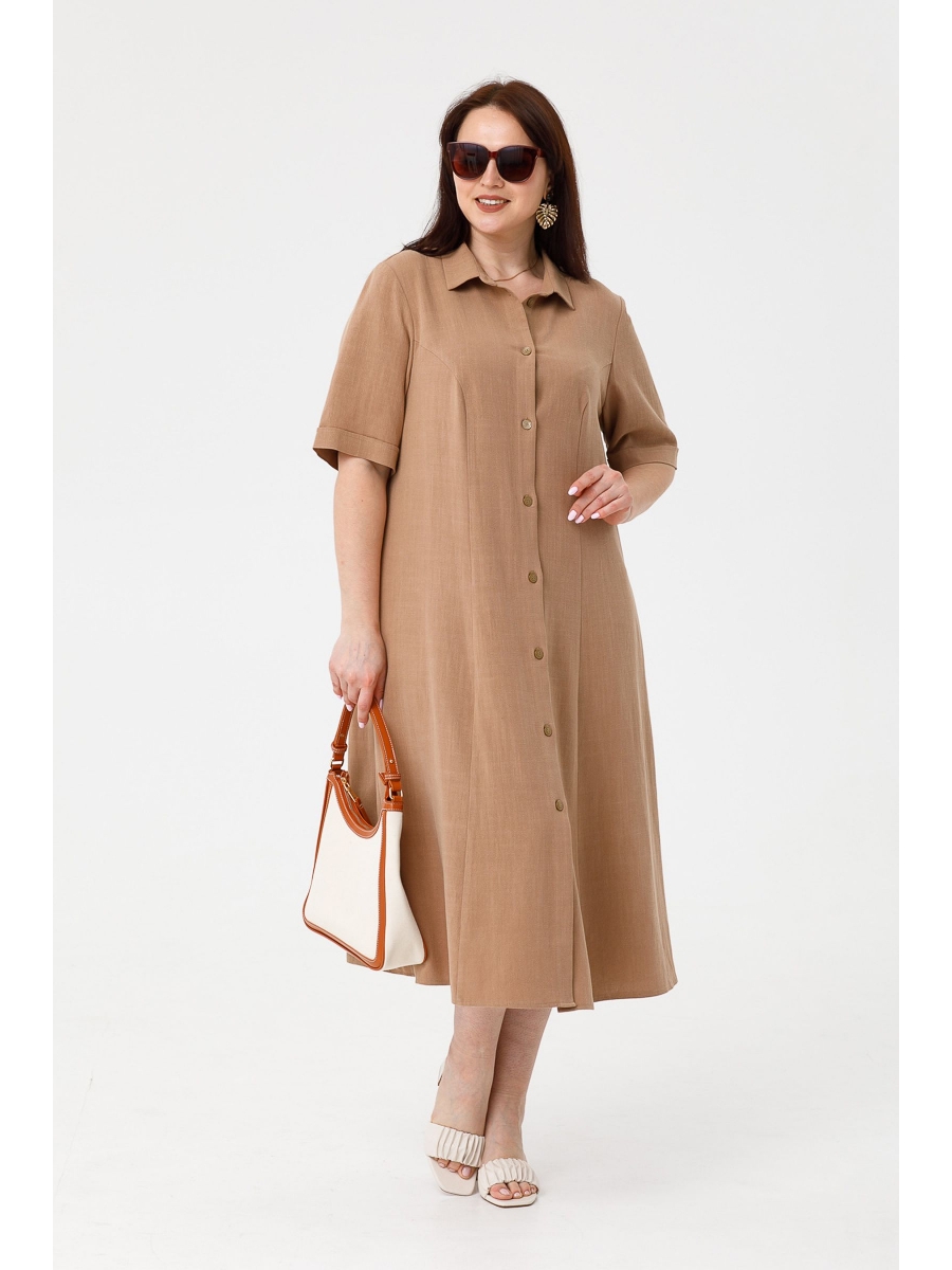 Платье полуприлегающего силуэта из льняной ткани. По спинке и переду вертикальные рельефы. Горловина оформлена отложным воротником на притачной стойке. По переду планка по всей длине изделия, с застежкой на петли и пуговицы. Втачной укороченный рукав по низу дополнен цельнокроенной манжетой. Низ прямой. В боковых швах удобные карманы.