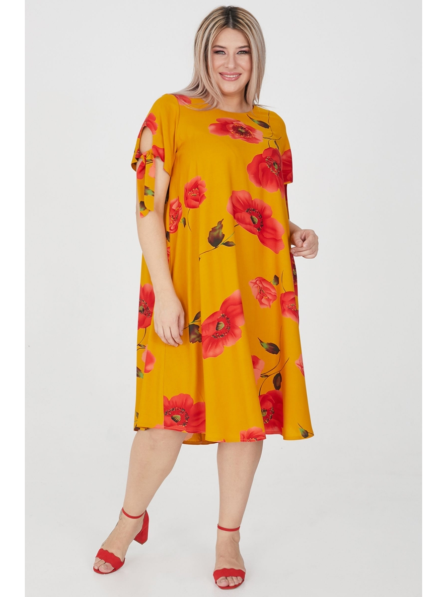 Комфортное платье А-образного силуэта из плательной ткани в яркий принт. Круглый вырез горловины обработан внутренней обтачкой. Спинка со средним швом, вверху оканчивающимся разрезом с застежкой на петлю и пуговицу. В боковых швах удобные карманы. Втачные укороченные рукава с круглым вырезом, по низу дополнены завязками. Женственное, легкое платье станет прекрасным дополнением вашего летнего гардероба.