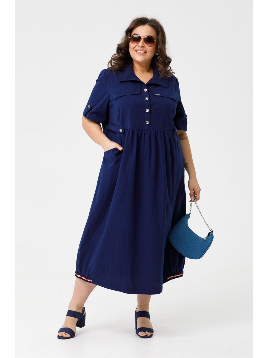 Платье свободного силуэта из хлопковой ткани. V-образный вырез горловины дополнен отложным воротником. Перед и спинка с отрезным лифом, по нижней части сборка. Прилегание по груди за счет рельефов. По центру лифа застежка на петли и пуговицы. Рукав втачной укороченный. В виде дополнительных элементов, по линии шва притачивания лифа и рукаву – паты с застежкой на петлю и пуговицу, на груди фигурные клапаны. Нижняя часть платья дополнена удобными карманами. Интересным дизайнерским решением является небольшая сборка по боковому шву внизу изделия, дополненная яркой тесьмой, по планке также оформление в виде яркой тесьмы. Низ ровный. Платье поможет создать стильный и женственный образ.