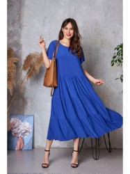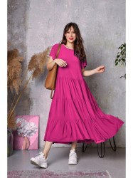 Платье женское трапециевидного силуэта из трикотажного полотна "масло"- идеальный вариант для повседневного образа. Будет отлично смотреться с босоножками, кроссовками или балетками. Отрезное по линии талии, с 3-мя воланами. Рукав короткий, расширенный к низу. Легкую непринужденность модели придают необработанные низ платья и рукава.