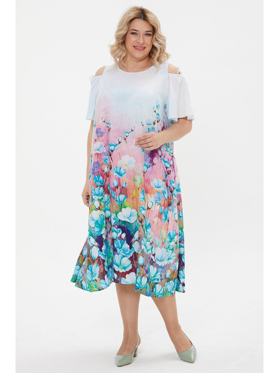 Женственное платье А - образного силуэта из купонной штапельной ткани с нежным принтом. Круглый вырез горловины обработан окантовкой. Рукава втачные, укороченной длины, верх рукава с открытой линией плеча, дополненной кулиской и завязками, низ оформлен ролевым швом. В боковых швах удобные карманы. Низ изделия ровный. Отличный выбор для повседневных образов.