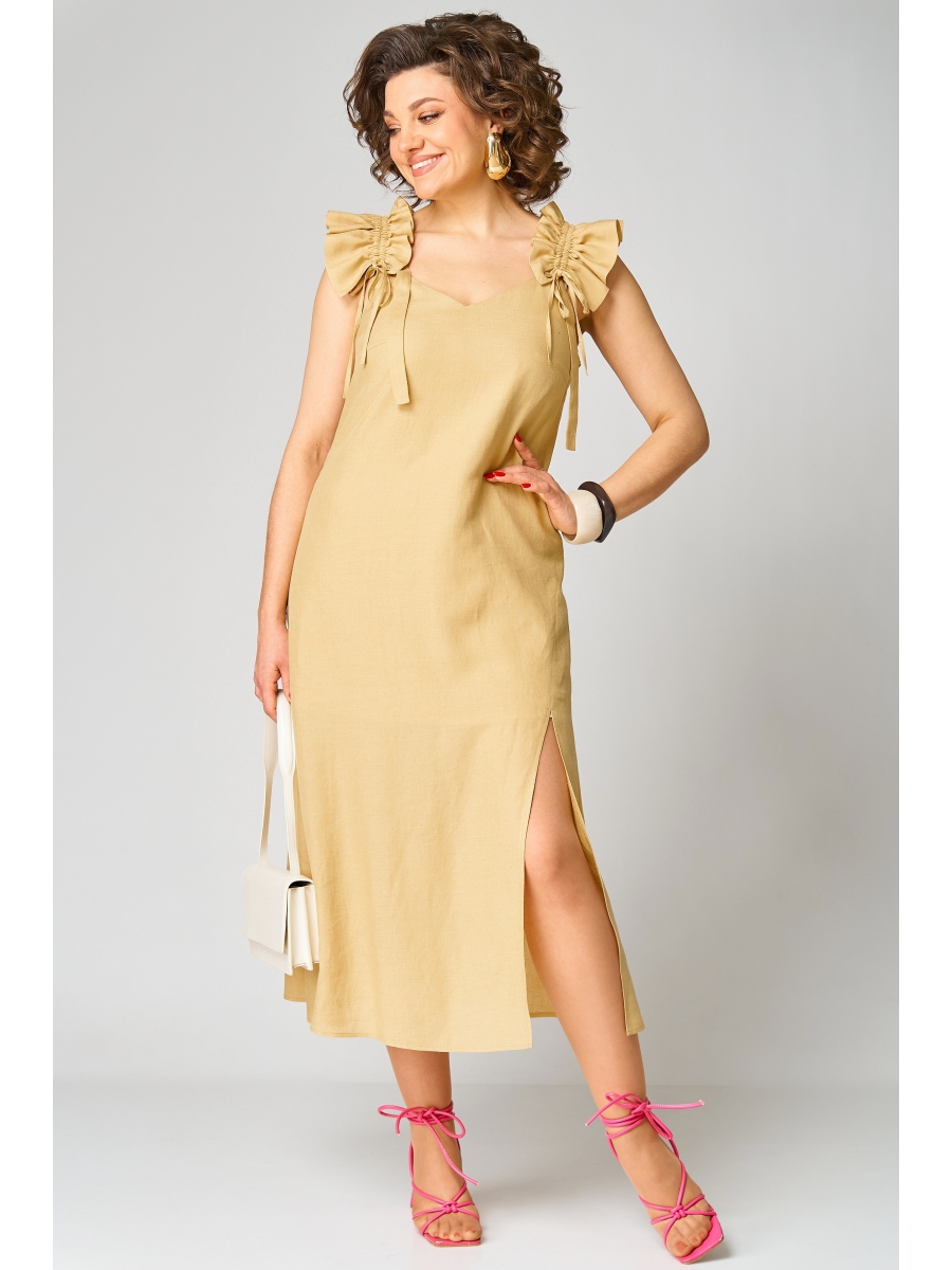 Платье полуприлегающее А-силуэта на тонких бретелях с застежкой. Горловина по переду V-образной формы. По переду нагрудные вытачки, а спинка - с рельефами. Застежка на потайную молнию в боковом шве. В комплекте съемные бретели из основной ткани, декорированные рюшей.