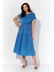 Платье женское, свободного силуэта, расширенное к низу. Рукав короткий, цельнокройный. Горловина круглой формы. По спинке небольшой разрез в средном шве, акцентирован декором "монетка". Разрез выше линии тали, по переду регулируется с фиксаторами. По центру спинки небольшая сборка. Подрез по линии бедер оформлен присобранным воланом.
