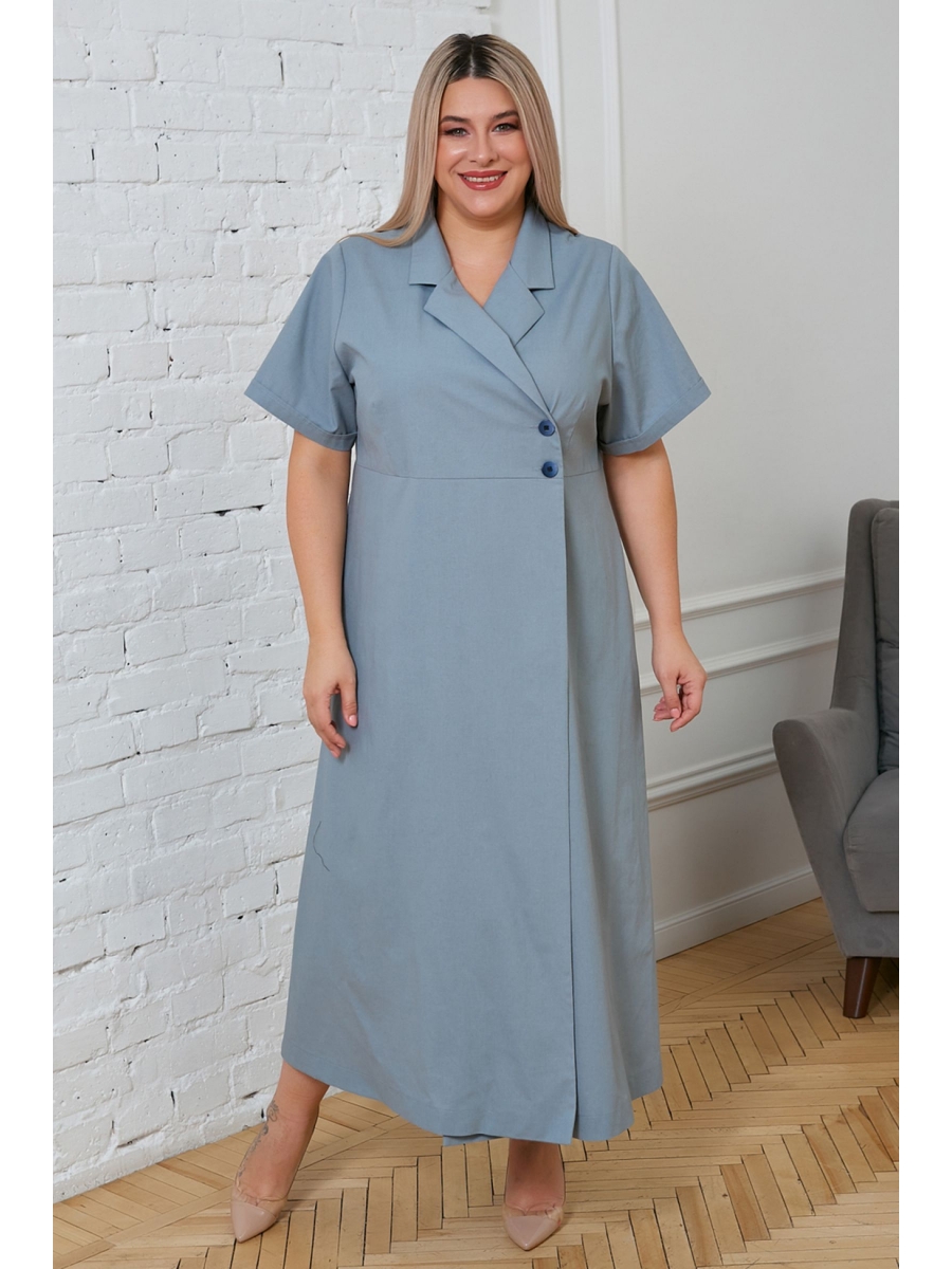 Платье на запах полуприлегающего силуэта длиной за щиколотку. Модель выполнена из льняной однотонной ткани. Линия - талии отрезная, прилегание лифа за счет вытачек переда и спинки. V-образный вырез горловины дополнен отложным воротником. Рукав втачной укороченный, по низу оформлен имитацией манжеты. В боковых швах удобные карманы. Борт фиксируется на 2 внешние и 1 внутреннюю пуговицы. Низ ровный. Отличный выбор для летних прогулок и повседневного выхода.