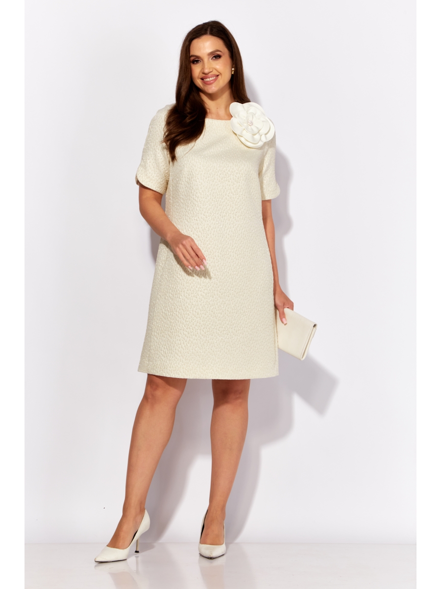 Платье женское, А силуэта с коротким рукавом. Рукав покроя "реглан" с фигурным разрезом. Вырез горловины круглой формы. По спинке застежка на навесную петлю и пуговицу и вырез "капля" Силуэтность платью придают рельефы переда и спинки с цельнокройными бочками.
