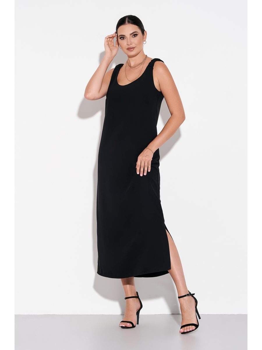Женское платье миди свободного силуэта на широких бретелях с резинками и разрезом по боковому шву выполнено из мягкой непросвечивающейся ткани.