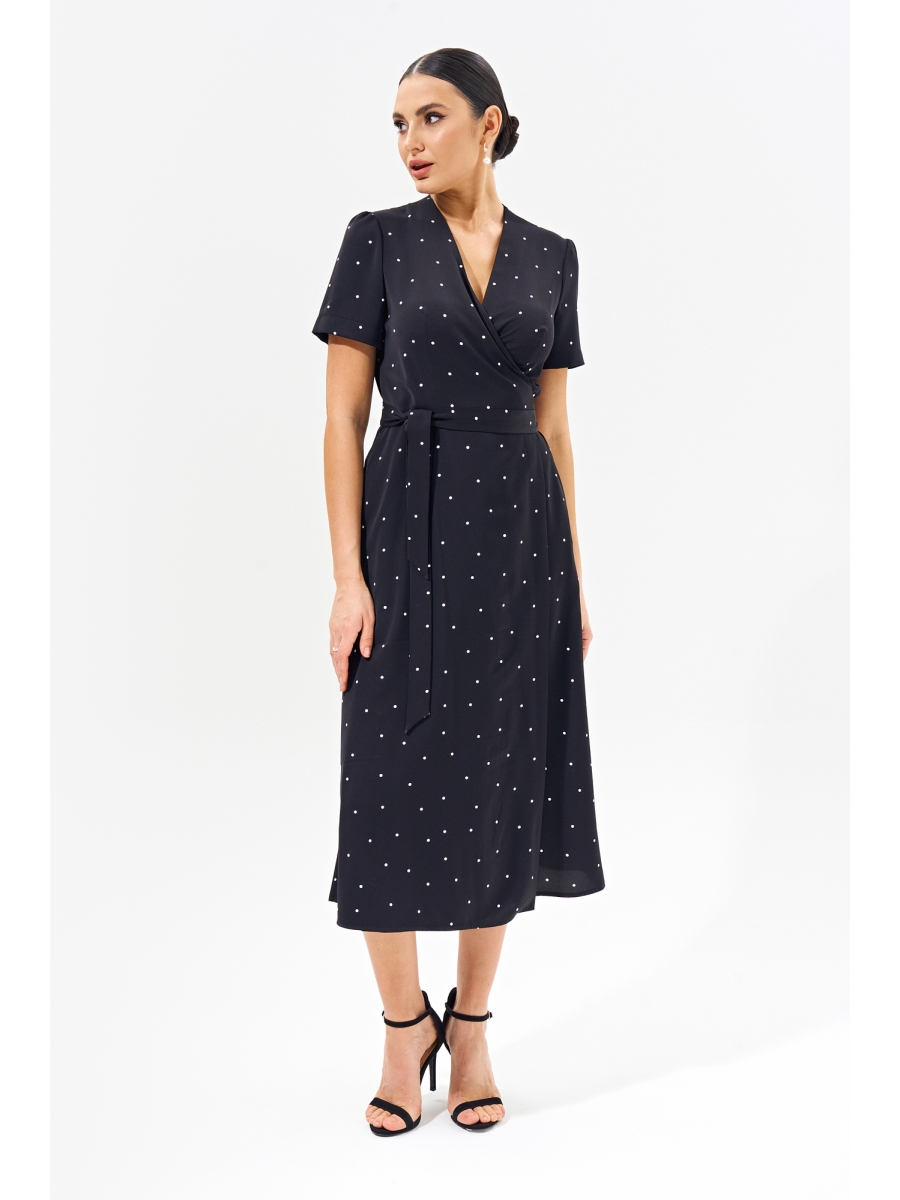 Классическое женское платье с запахом выполнено из легкой струящейся ткани. Изделие отрезное по линии талии со втачными рукавами и карманами в боковых швах.
