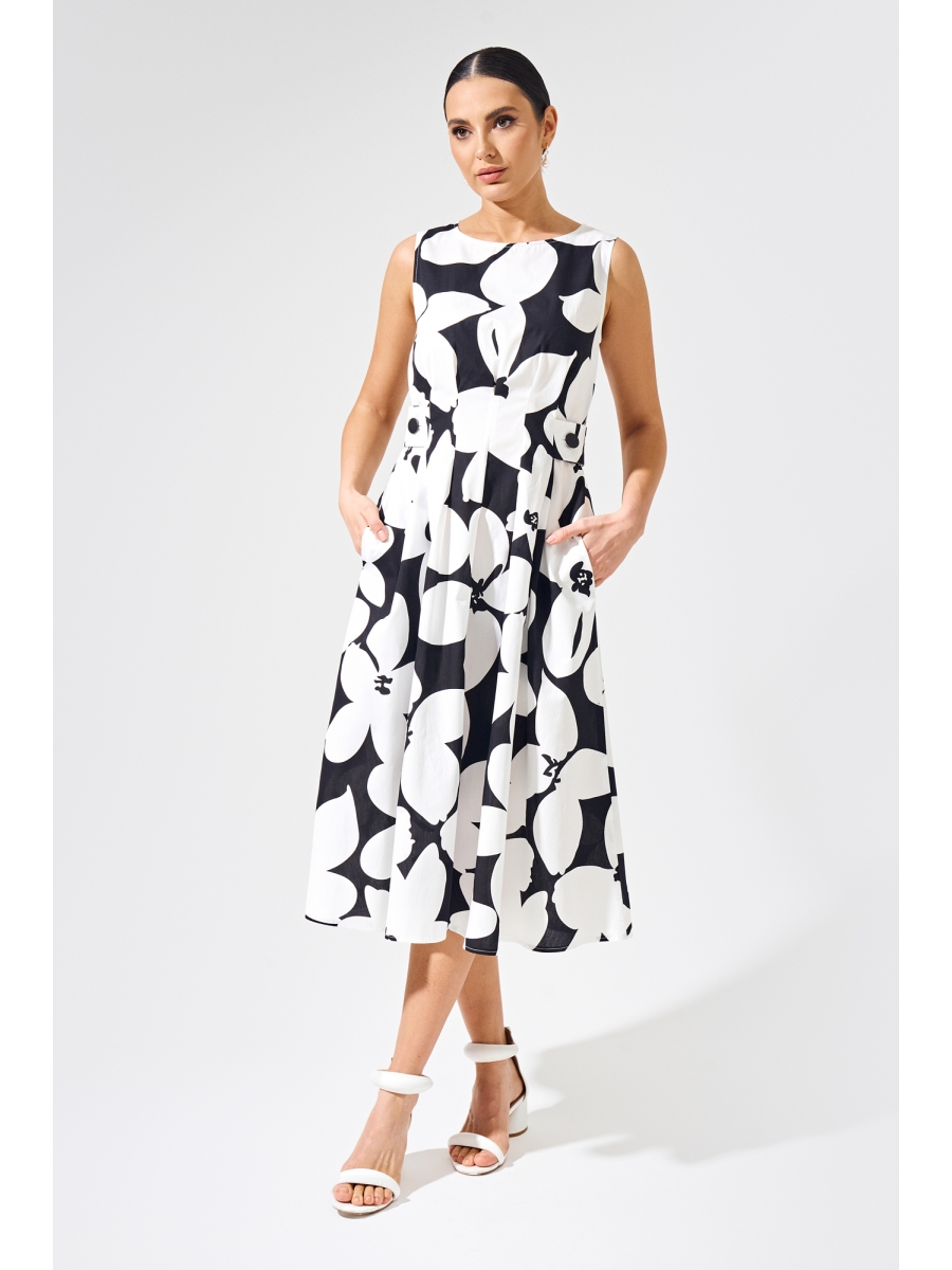 Женское платье А-силуэта с карманами в боковых швах и декоративными складками по линии талии, в которые вставлены регулируемые функциональные паты с пуговицами. Изделие выполнено из натуральной хлоповой ткани с дизайнерским принтом и застегивается по спинке на потайную молнию.