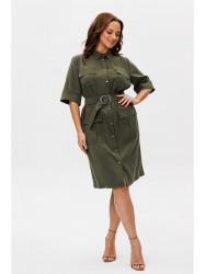 Четкий прямой силуэт платья подчеркивает женственность, сохраняя свободу движений. Втачной короткий рукав с аккуратной манжетой и рубашечный воротник на стойке придают образу собранность и завершенность. Практичность здесь сочетается с эстетикой – застежка на кнопках по всей длине позволяет легко регулировать степень открытости, а настрочные карманы с клапанами добавляют характерный штрих сафари-эстетики. Съемный пояс на пряжке дает возможность варьировать образ – от строгого делового до более непринужденного варианта.