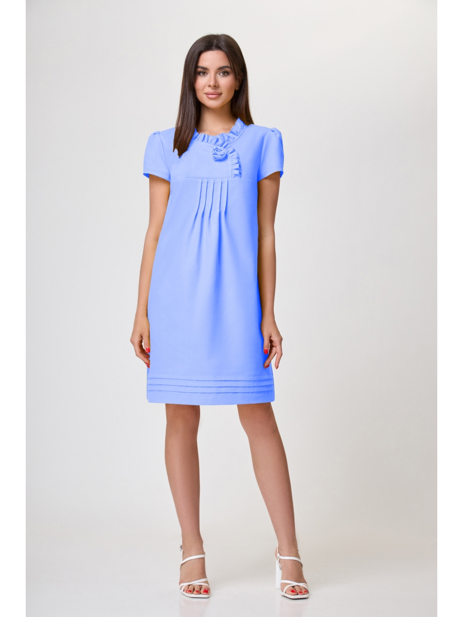 Платье женское полуприлегающего силуэта длиной выше колен. Рукав втачной короткий. По окату рукава сборка. По переду платья кокетка. Ниже линии кокетки пять защипов. Вырез горловины назапах до уровня кокетки. Низ переда декорирован тремя горизонтальными складками. Спинка со средним швом и талиевыми вытачками.