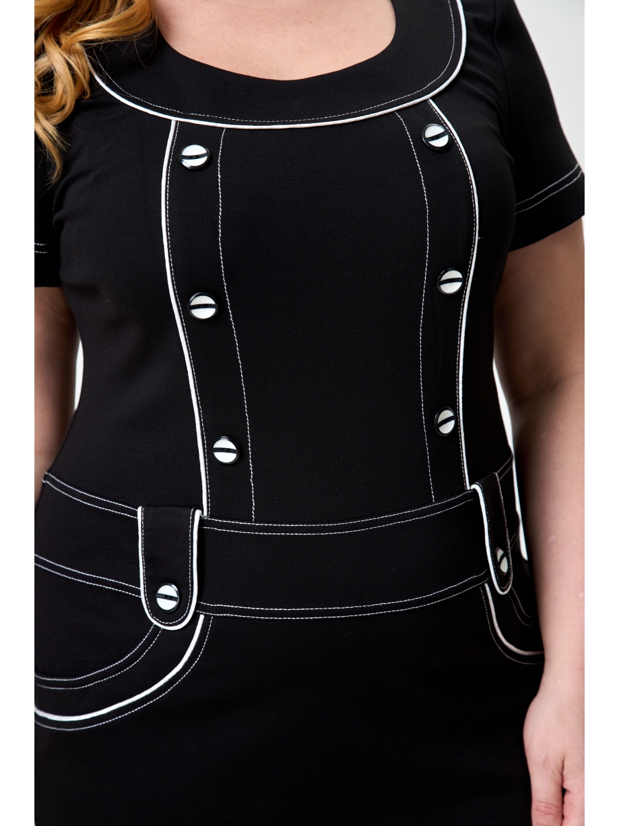 Платье женское приталенного силуэта, длиной до колена. По переду рельефы с декором, отделочная контрастная строчка и пуговицы, карманы (декоративные или функциональные? Образца нет у меня, я не знаю, если у вас есть посмотрите и допишите) Рукав втачной короткий. Платье универсальный вариант для работы/учебы, отлично будет смотреться, как с жакетом, так и с лёгкий пальто/тренчем.