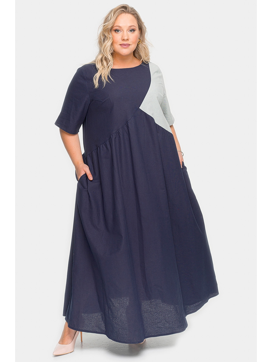 Платье длинное, свободного силуэта, из смесовой ткани, содержащей в составе лен и вискозу. Нижняя часть платья отрезная, присборенная. Линия подреза по переду фигурная, по спинке горизонтальная. Основной цвет темно-синий. Левая часть переда и левый рукав из отделочной ткани жемчужного оттенка такого же качества как основной материал. В боковых швах карманы. Рукав втачной, свободный.