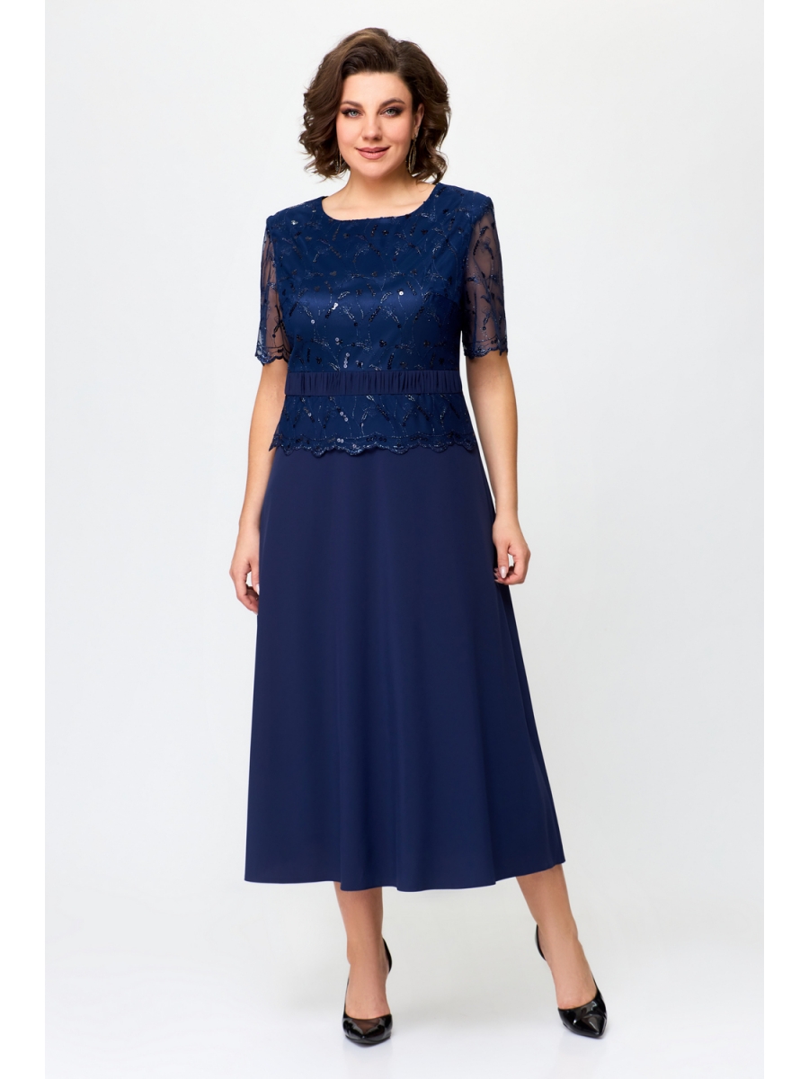 Платье женское расклешенное к низу, с коротким рукавом. Платье отрезное по линии талии. Верхняя часть переда декорирована гипюром с баской. По линии груди вытачки. Спинка со средним швом, потайной застежкой молнией. Верхняя часть спинки с вытачками по линии талии. Рукав втачной одношовный из гипюра.