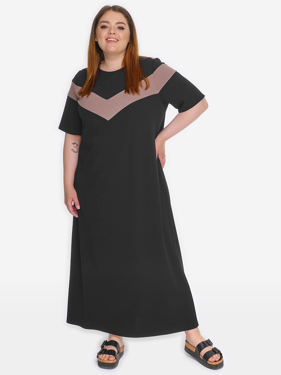 Платье свободное, А-силуэта. По переду кокетка, выкроенная углом, к которой притачана полоса отделочной ткани. "Поддерживают идею" свободные рукава, также выполненные с отделочной полосой на том же уровне, что и на переде платья.