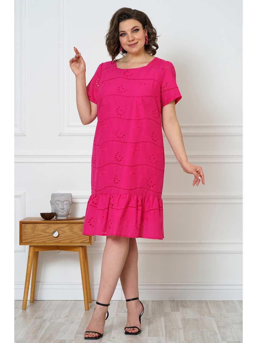 Платье силуэта А-образной формы, на подкладке, с притачной кокеткой переходящая на перед и спинку, по спинке с разрезом в среднем шве кокетки и с застёжкой на навесную петлю и пуговицу, с втачными рукавами, понизу с притачной оборкой по шву соединения со сборкой. Перед с нагрудными выточками. Спинка со средним швом. Рукава одношовные, короткие, по окату со сборкой.