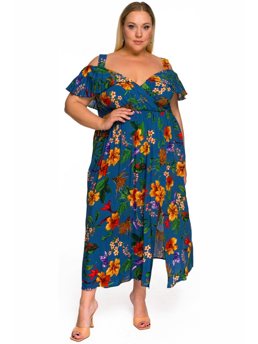 Воздушное платье-сарафан из 100% вискозы. Верхняя часть отрезная, с запахом, на бретелях (ширина бретели 4 см), конструктивно продумана и ненавязчиво открывает зону декольте. По вырезу горловины переда и спинке втачан волан, на уровне руки переходящий в "крылышко". По шву соединения юбки с лифом резинка, не стесняющая движений, но одновременно прорисовывающая линию талии.