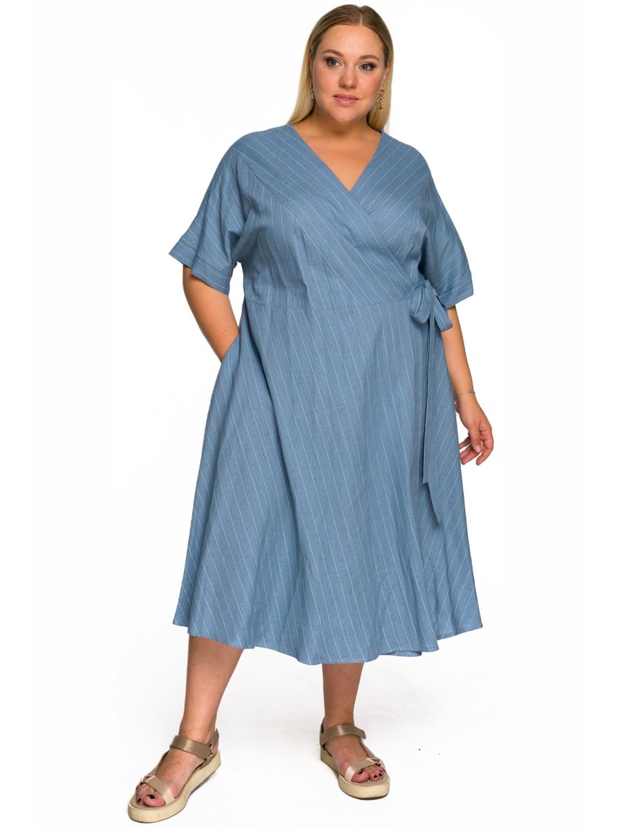 Классическое городское платье с запахом из льна, отрезное по линии талии. Линия плеча спущена и заканчивается планочкой.
