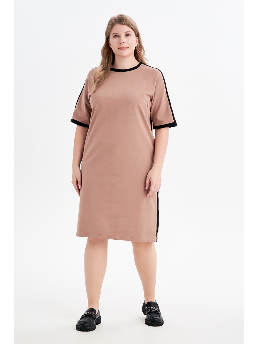 Женское платье больших размеров прямого кроя выполнено из мягкого трикотажного полотна по типу футер двухнитка.