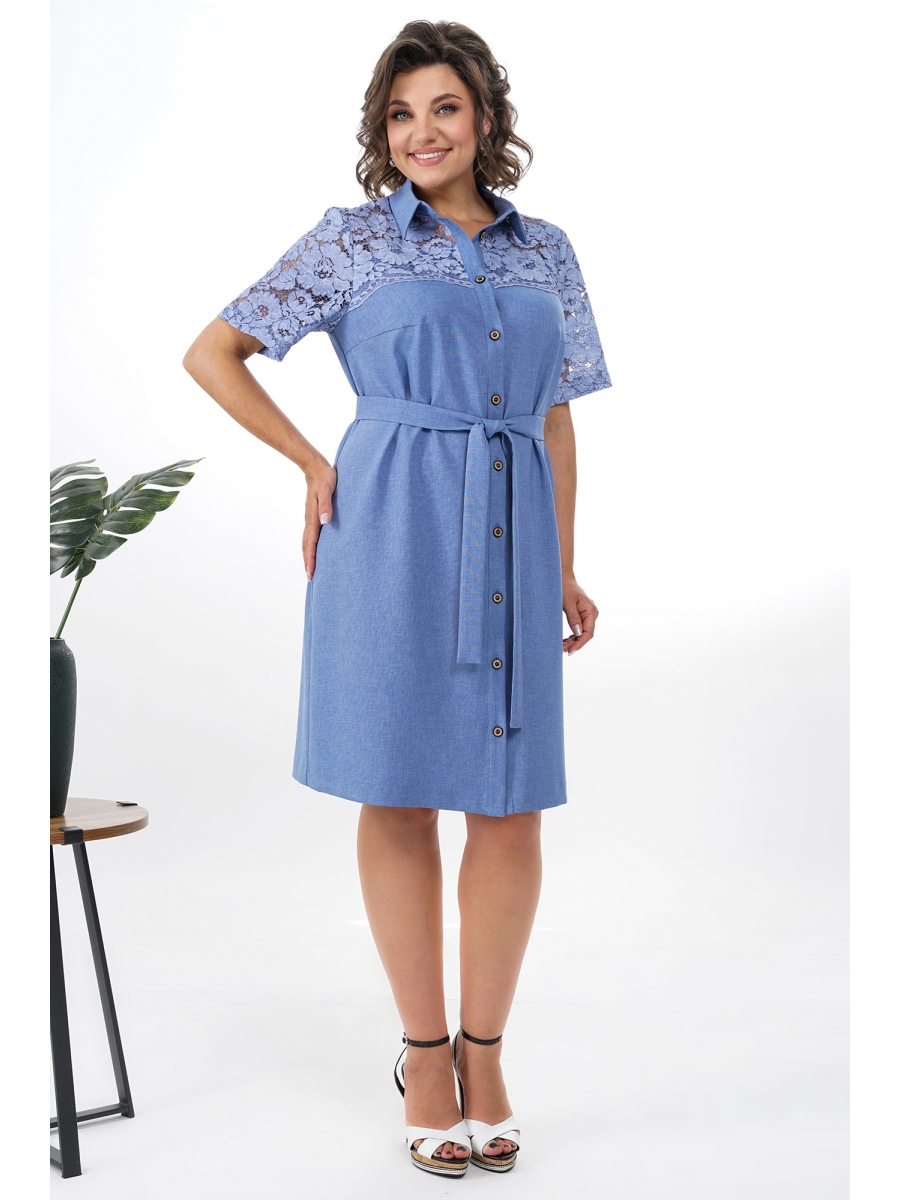 Платье полуприлегающего силуэта, в дополнении с поясом, с застёжкой по притачной планке на петли, пуговицы, с притачными кокетками. Перед с нагрудными выточками. Рукава втачные, одношовные, короткие. Воротник стояще-отложной на отрезной стойке застёгивающаяся на петлю, пуговицу. Кокетки и рукава выполнены из отделочной ткани кружево.