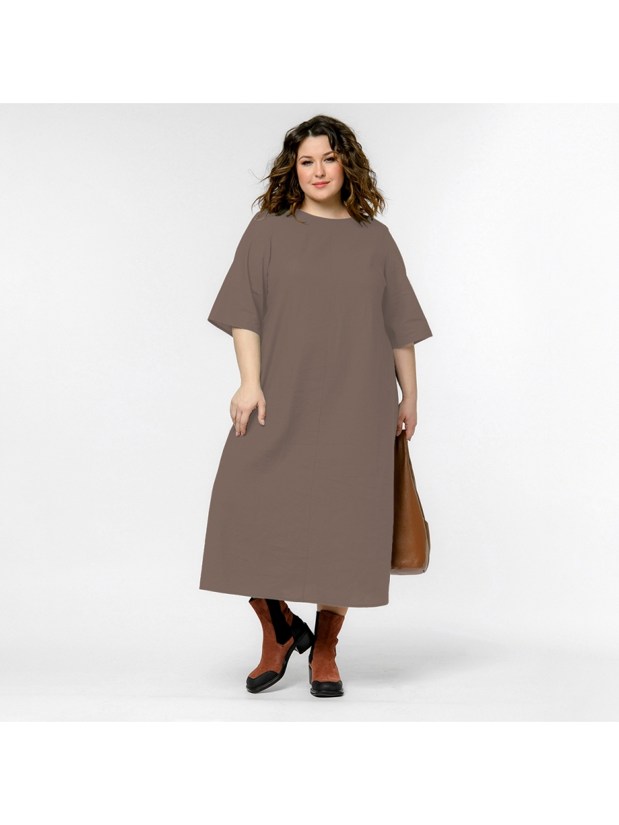 Платье свободного силуэта, из смесовой ткани, содержащей в составе лен и вискозу. Боковые швы смещены на переднюю половинку платья, в них обработаны карманы. Рукав втачной, свободный. Основным декоративным элементом является вырез горловины на спинке,в который вставлена резинка, образующая сборочку.