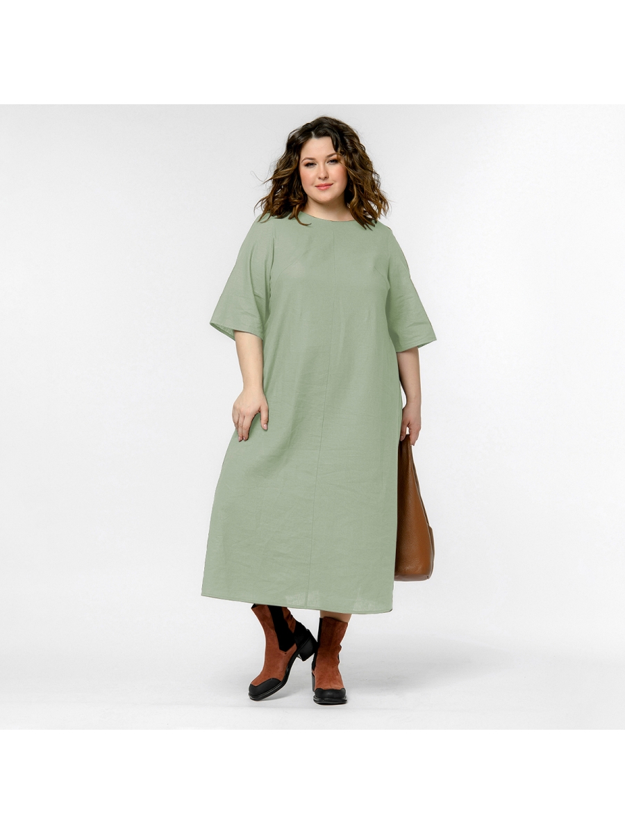 Платье свободного силуэта, из смесовой ткани, содержащей в составе лен и вискозу. Боковые швы смещены на переднюю половинку платья, в них обработаны карманы. Рукав втачной, свободный. Основным декоративным элементом является вырез горловины на спинке,в который вставлена резинка, образующая сборочку.