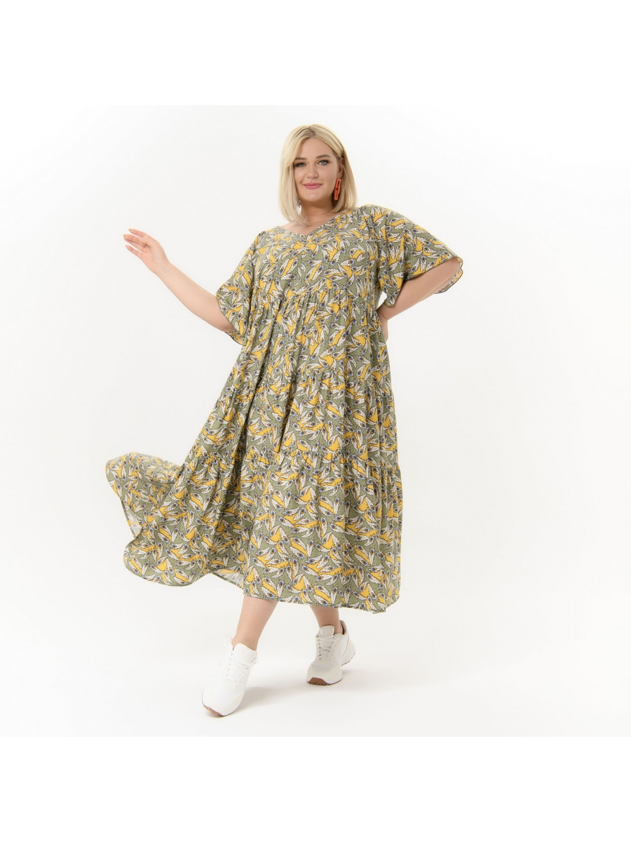 Платье из штапеля свободного силуэта. Отрезное по линии груди, нижняя часть платья присборена.